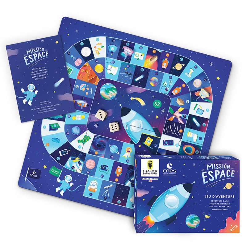 Une mission spatiale se déroule tout au long de la célèbre spirale pour atteindre la case 63 en premier. Les fusées aident à avancer plus vite, mais attention au trou noir et autres cases pièges !
